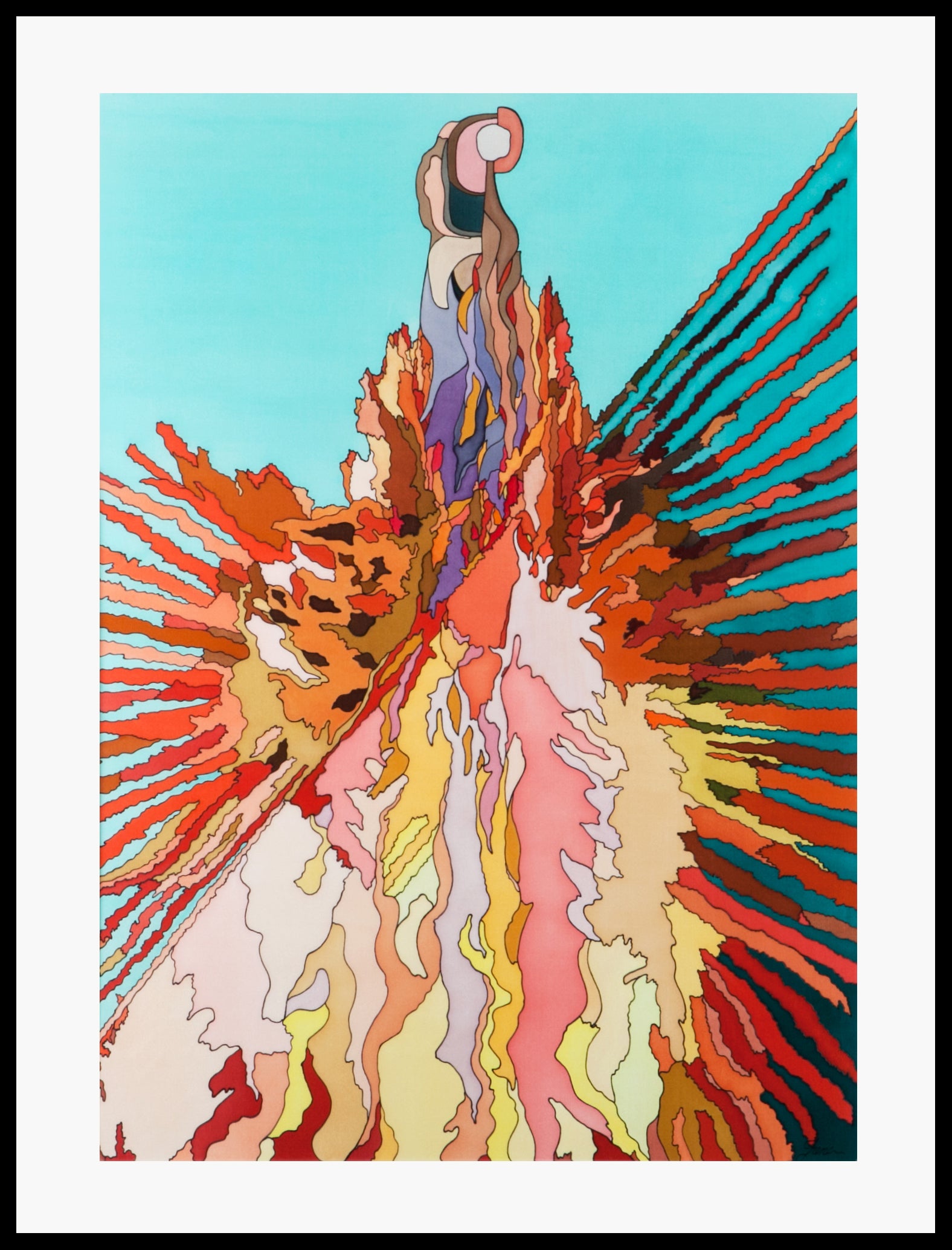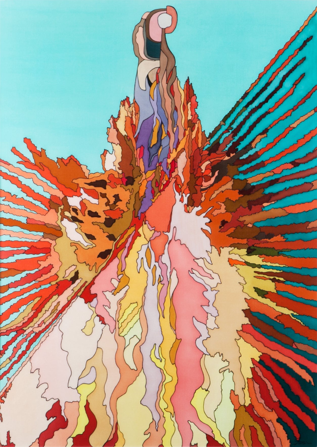 In this silk painting, I have tried to depict my experience in the station of awareness after a few months of meditation. I created this painting on silk using French acid dyes, and to set the colours permanently, I used the steam setting technique.