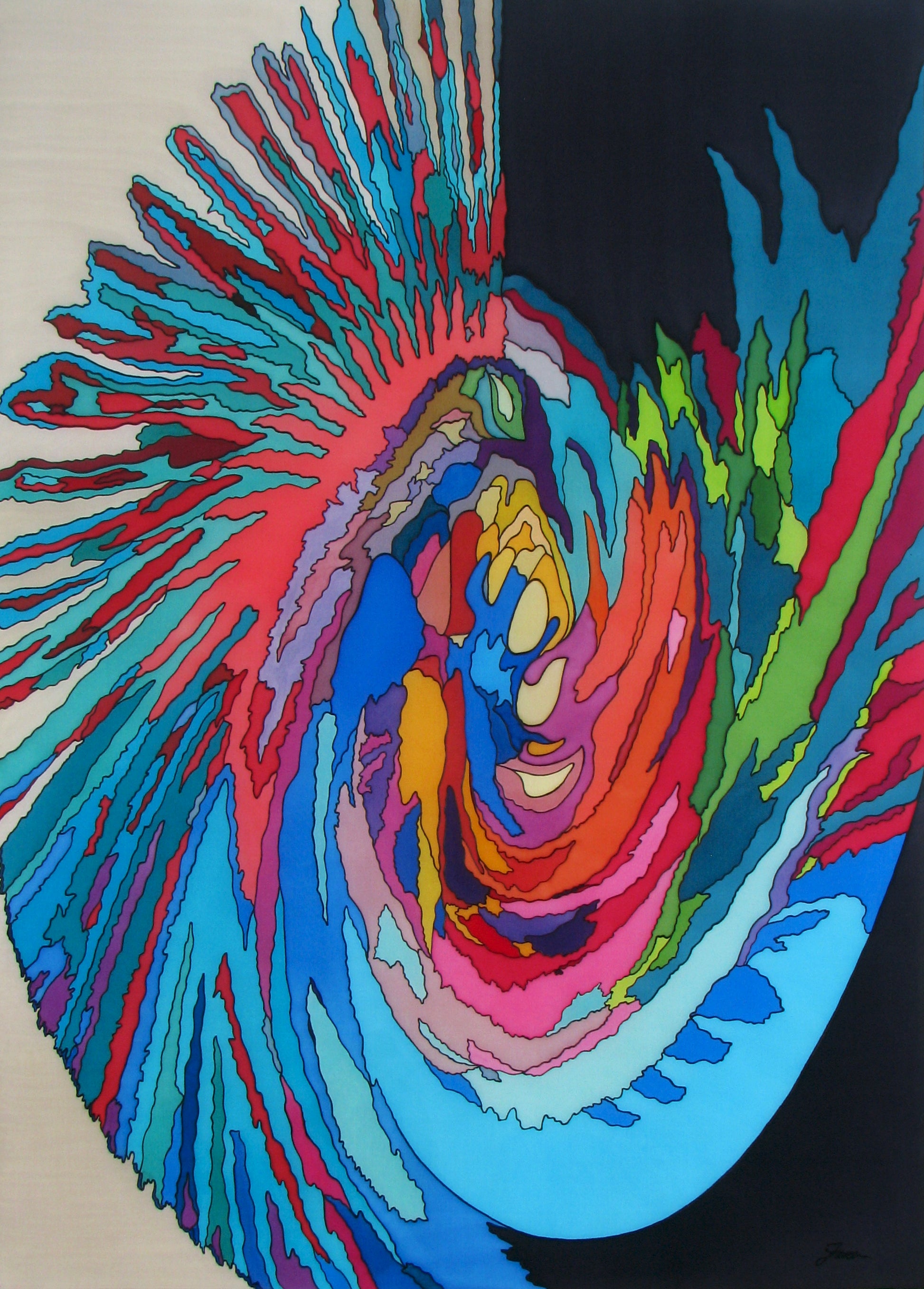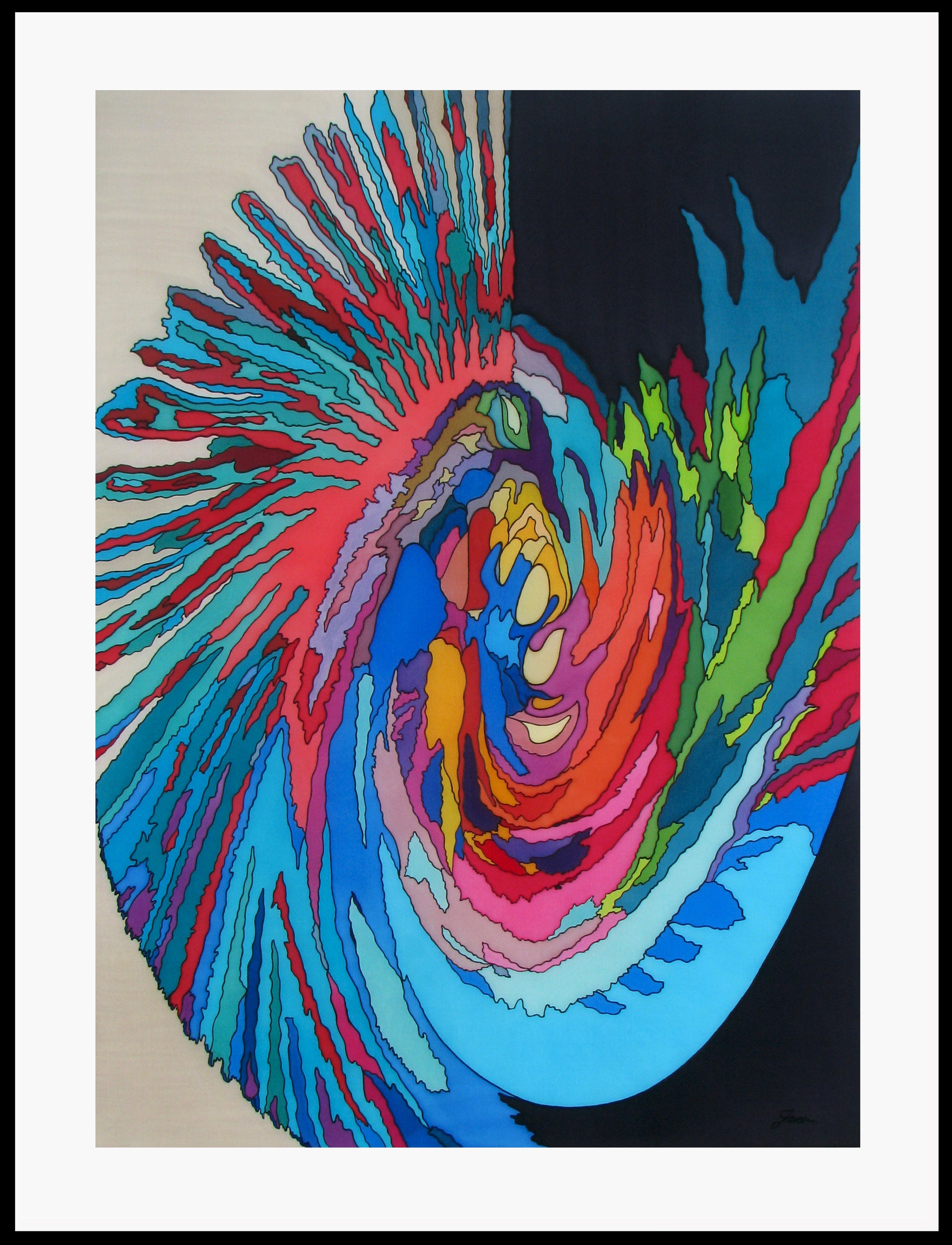 In this silk painting, I have tried to metaphorically depict how external pressure, applied by the bird's beak, leads to the breaking of the egg and ultimately the death of the chick inside. If this pressure had naturally come from within the egg, it could have signified the beginning of life.To set the colours permanently,I used the steam setting technique.