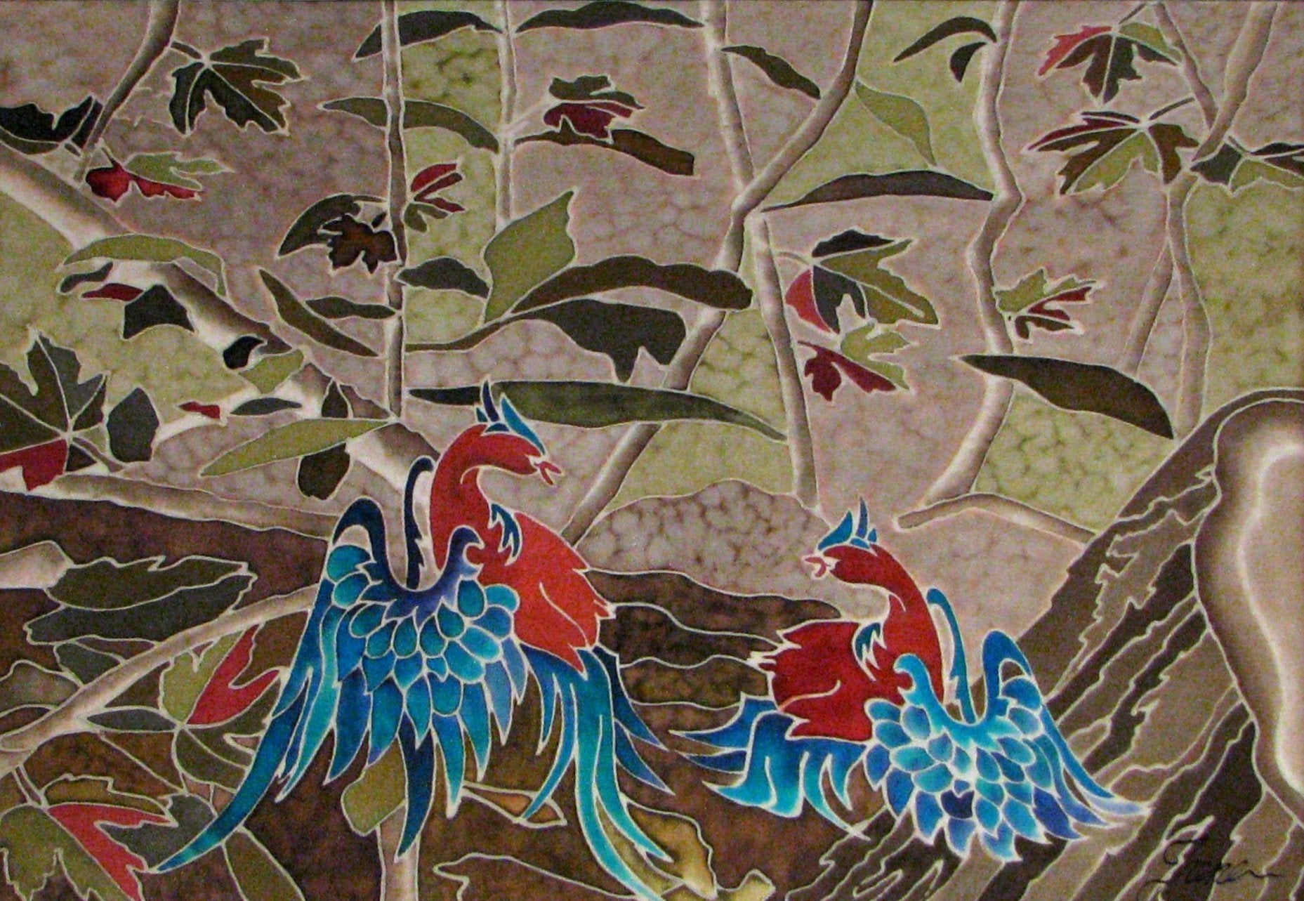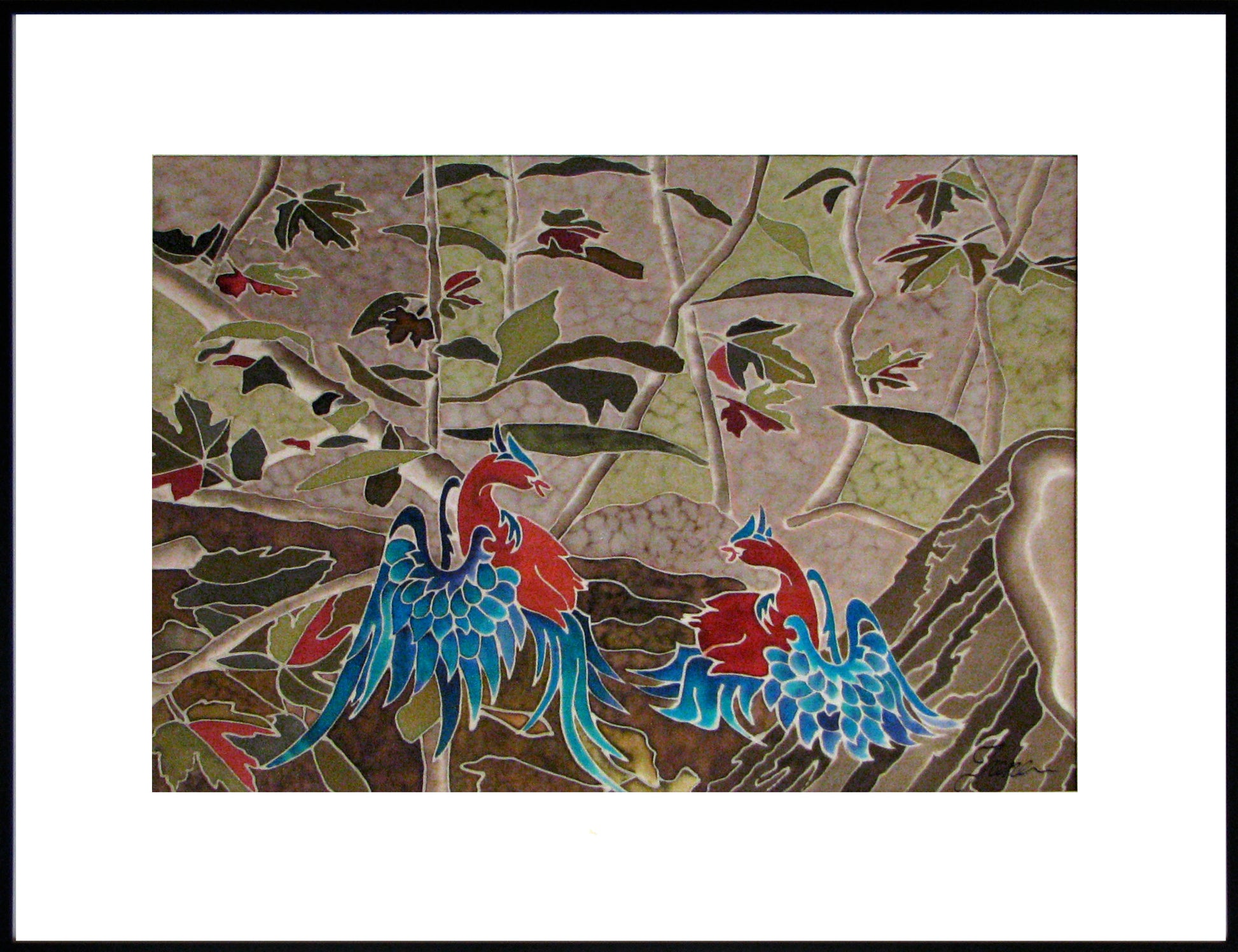 In this silk painting, I aim to capture the beauty of a romantic theme. The serene natural setting of the forest serves as a tranquil backdrop, enhancing the emotional depth of the intimate moment shared between the birds.To set the colours permanently,I used the steam setting technique.