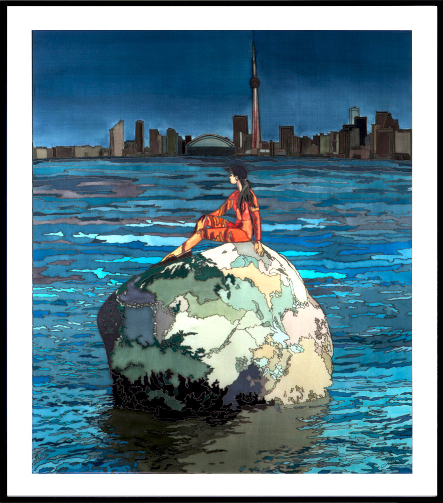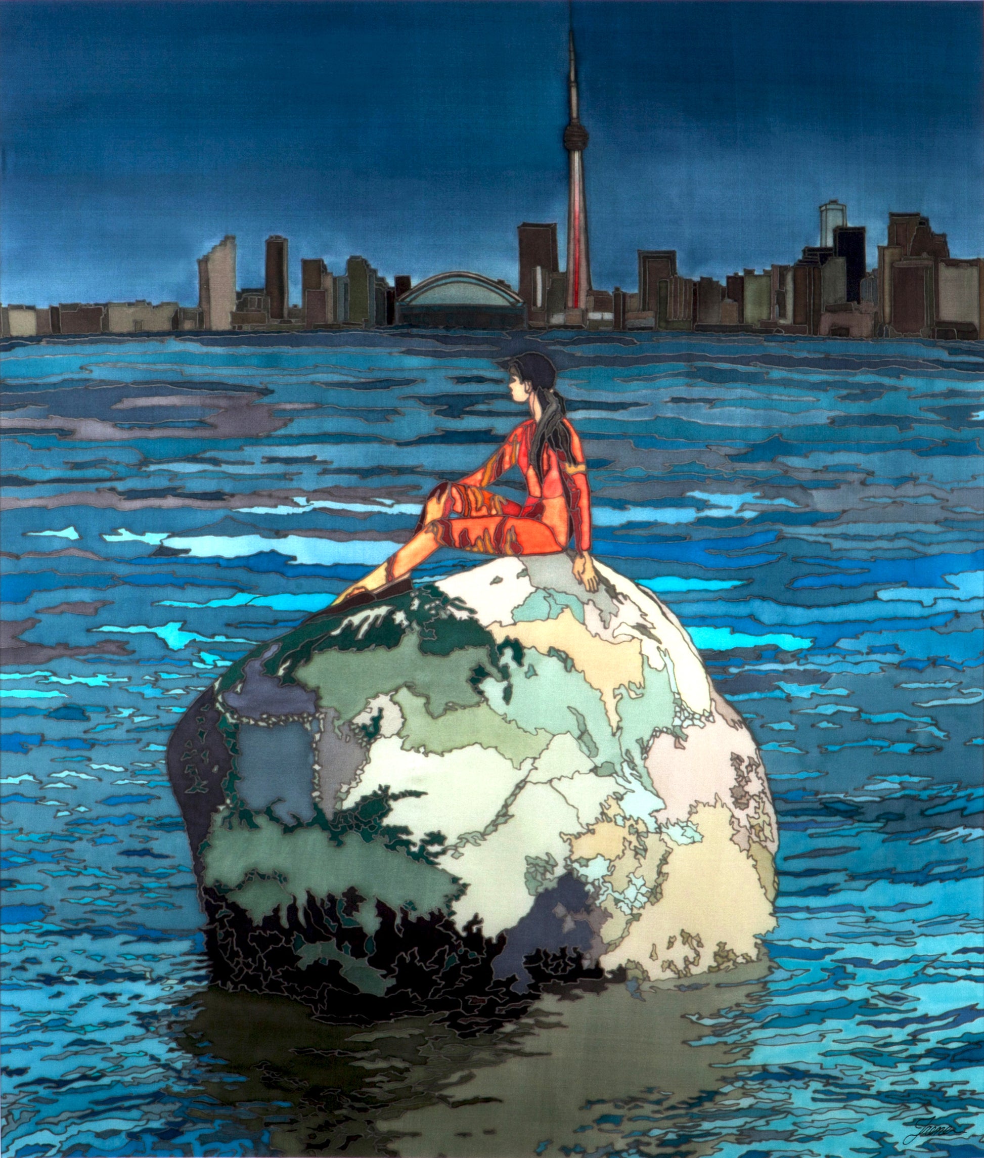 In this silk painting, I have tried to depict the memory of loneliness during the first month of migration as follows: a woman sitting alone on a large rock, gazing into the distance. The woman sitting in the middle of the water symbolizes resilience. The use of cold, dark, and grey colours gives a more realistic sense of uncertainty and an unknown future. To set the colours permanently, I used steam setting techniques.