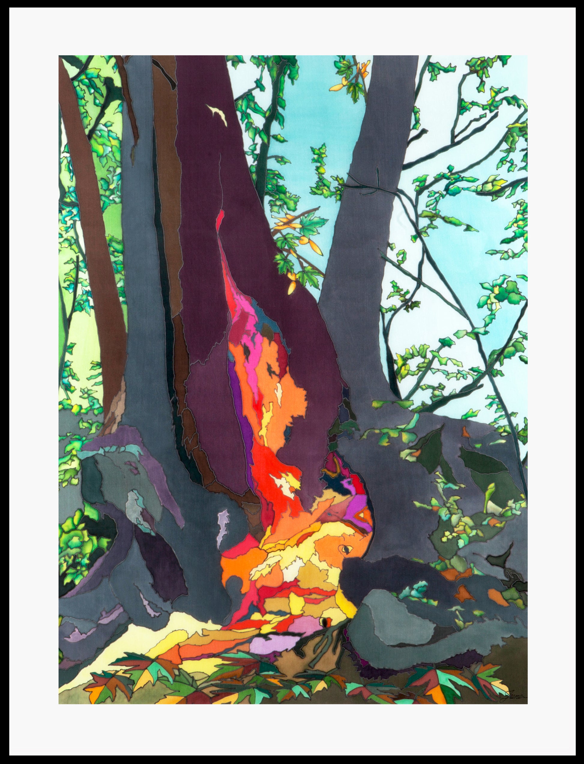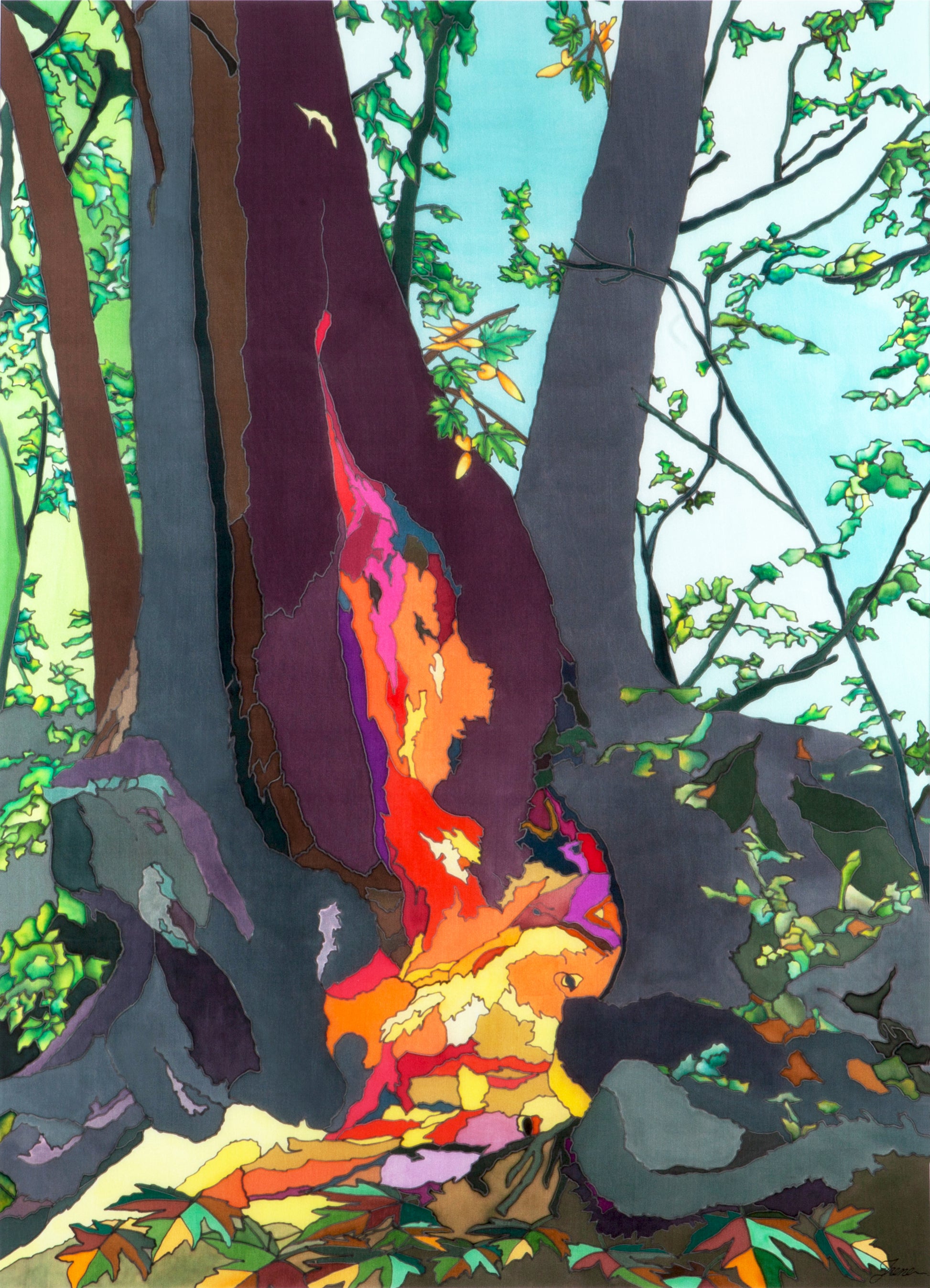 In this silk painting, I have depicted the processes of meditation or inner purification through the metaphor of a tree undergoing purification and budding anew. To set the colours permanently, I used steam setting technique.