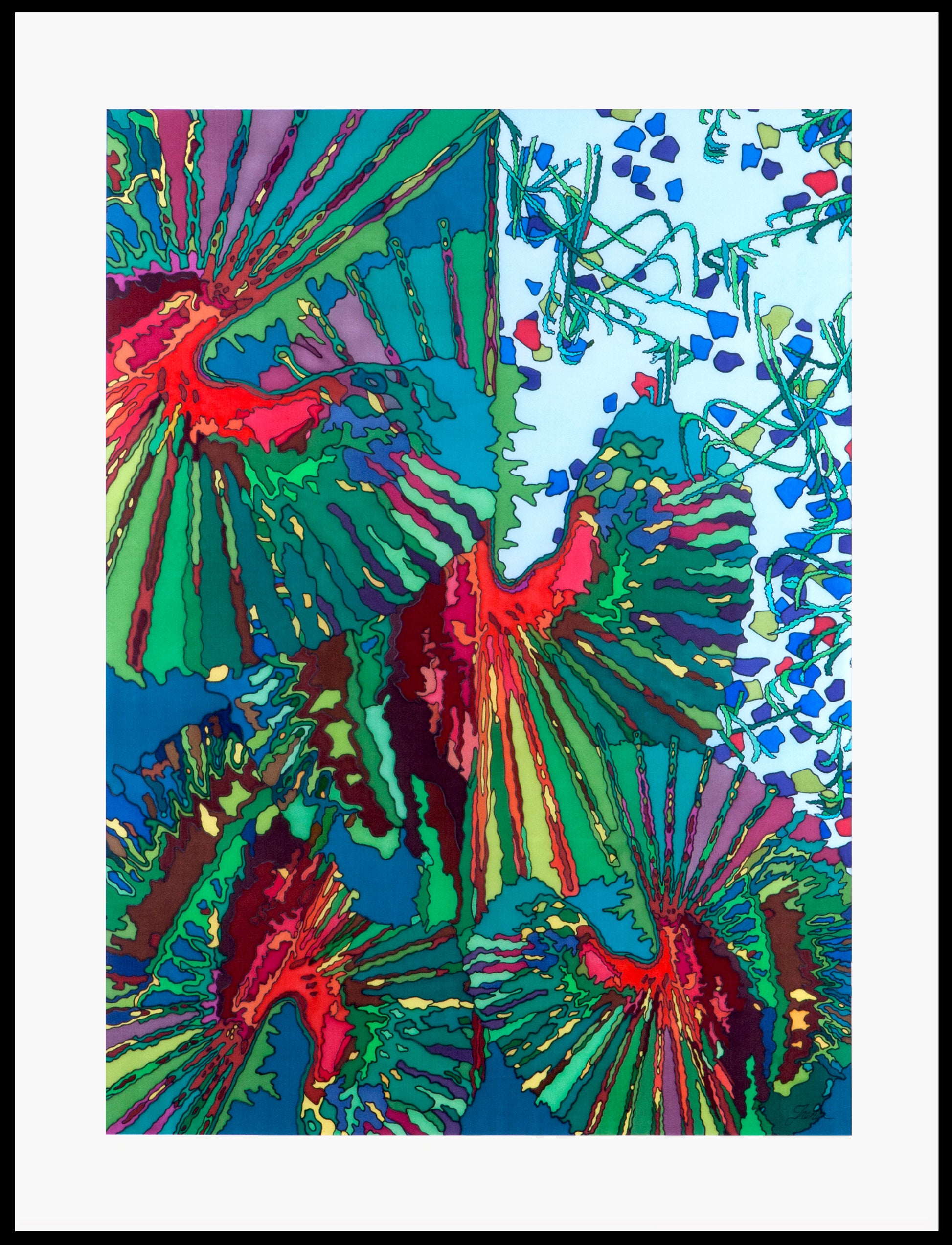Reproduction in nature involves biological processes that lead to the production and renewal of living organisms. In this silk painting, I have tried to depict the concept of reproduction metaphorically through the repetition of elements and colours. To set the colours permanently, I used steam setting techniques.