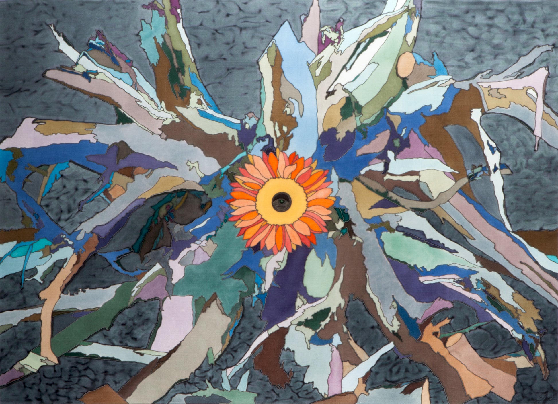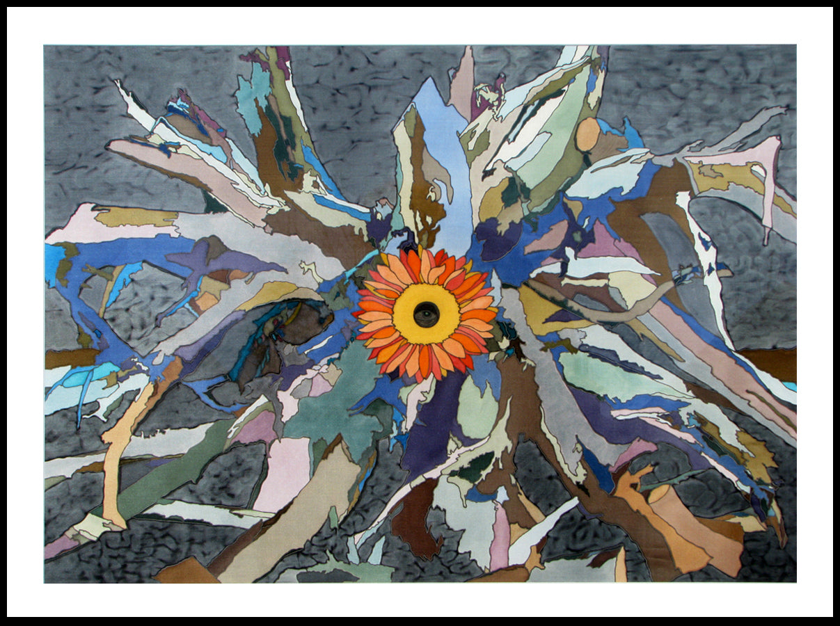 My silk painting is metaphorically painted. The dry branches in the background signify despair in society, but the presence of a flower with vibrant colours restores hope to the community.. To set the colours permanently,I used the steam setting technique.