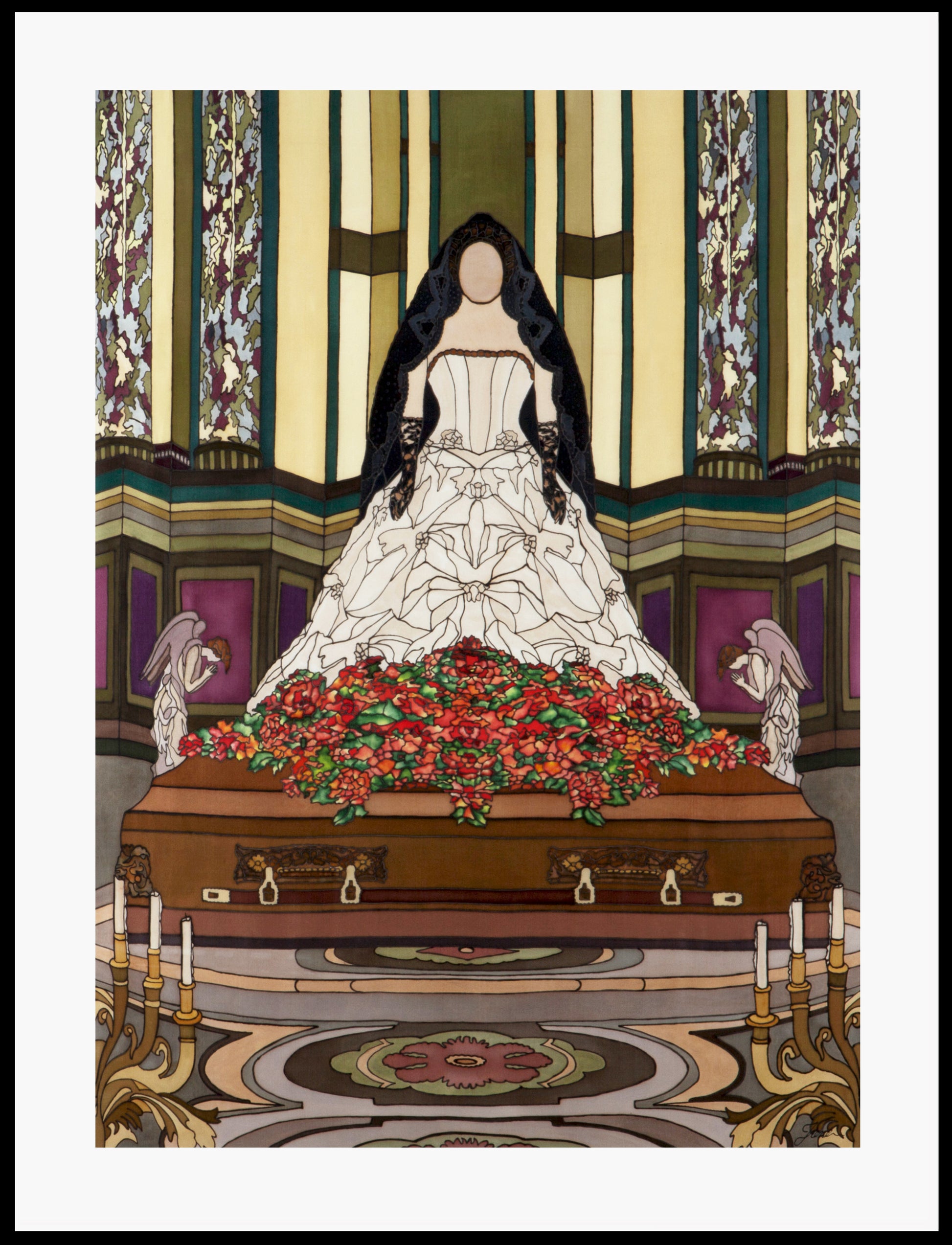 In this silk painting, I aimed to depict symbols such as red roses on the coffin to represent the woman’s endless love for her husband in death. The black gloves and veil symbolize her deep sorrow and grief in the face of this tragedy. To set the colours permanently, I used steam setting techniques.