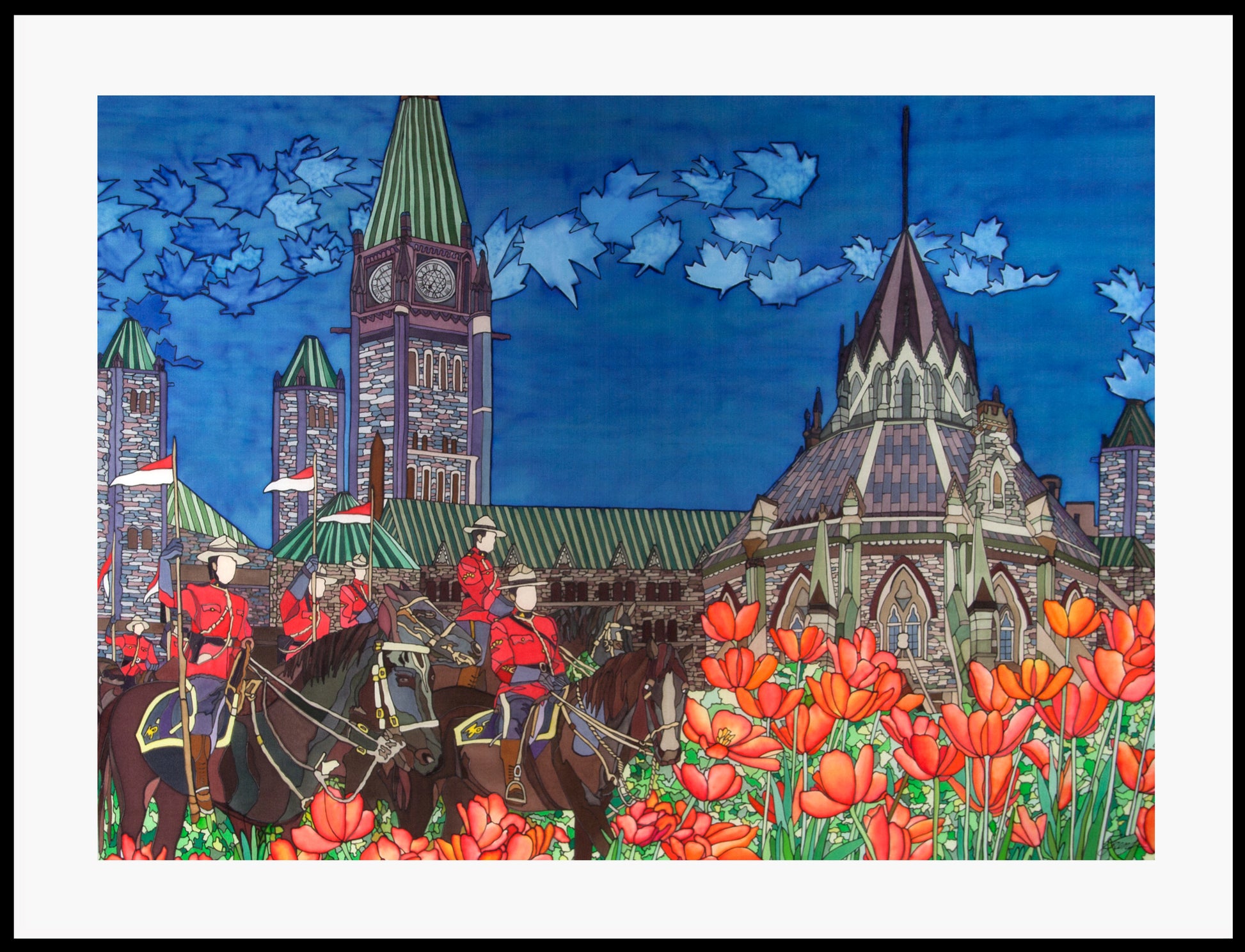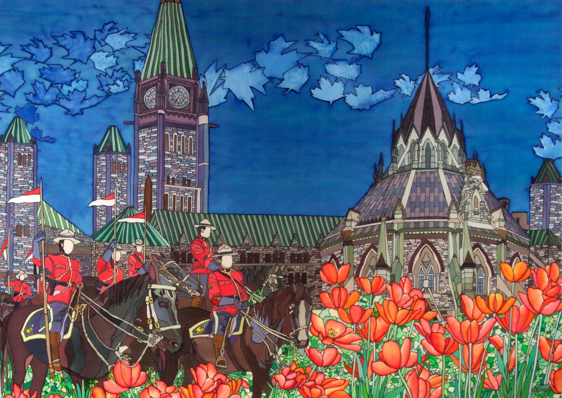 "Touch of Canada" refers to the vibrant celebrations and ceremonies held on Canada Day in Ottawa, the capital of the country. This significant event includes the parade of the Royal Canadian Mounted Police (RCMP). This silk painting is part of my memories from that day. The tulips around the Parliament Buildings symbolize those who courageously gave their lives for this land.