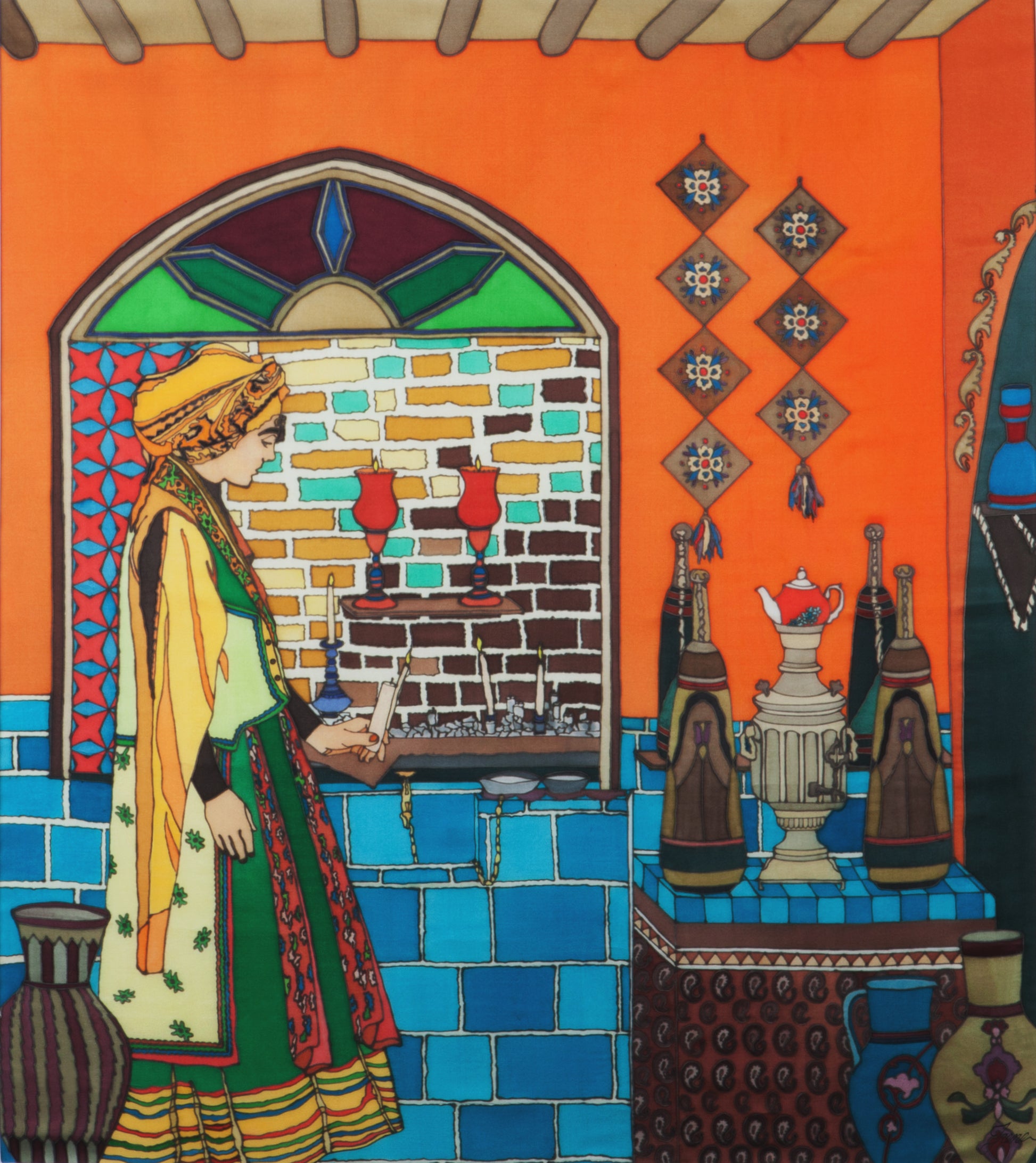 I have tried to depict an Iranian Qashqai woman dressed in beautiful local attire, holding a candle and expressing her request to her Creator on silk. To set the colors permanently, I used steam setting techniques.