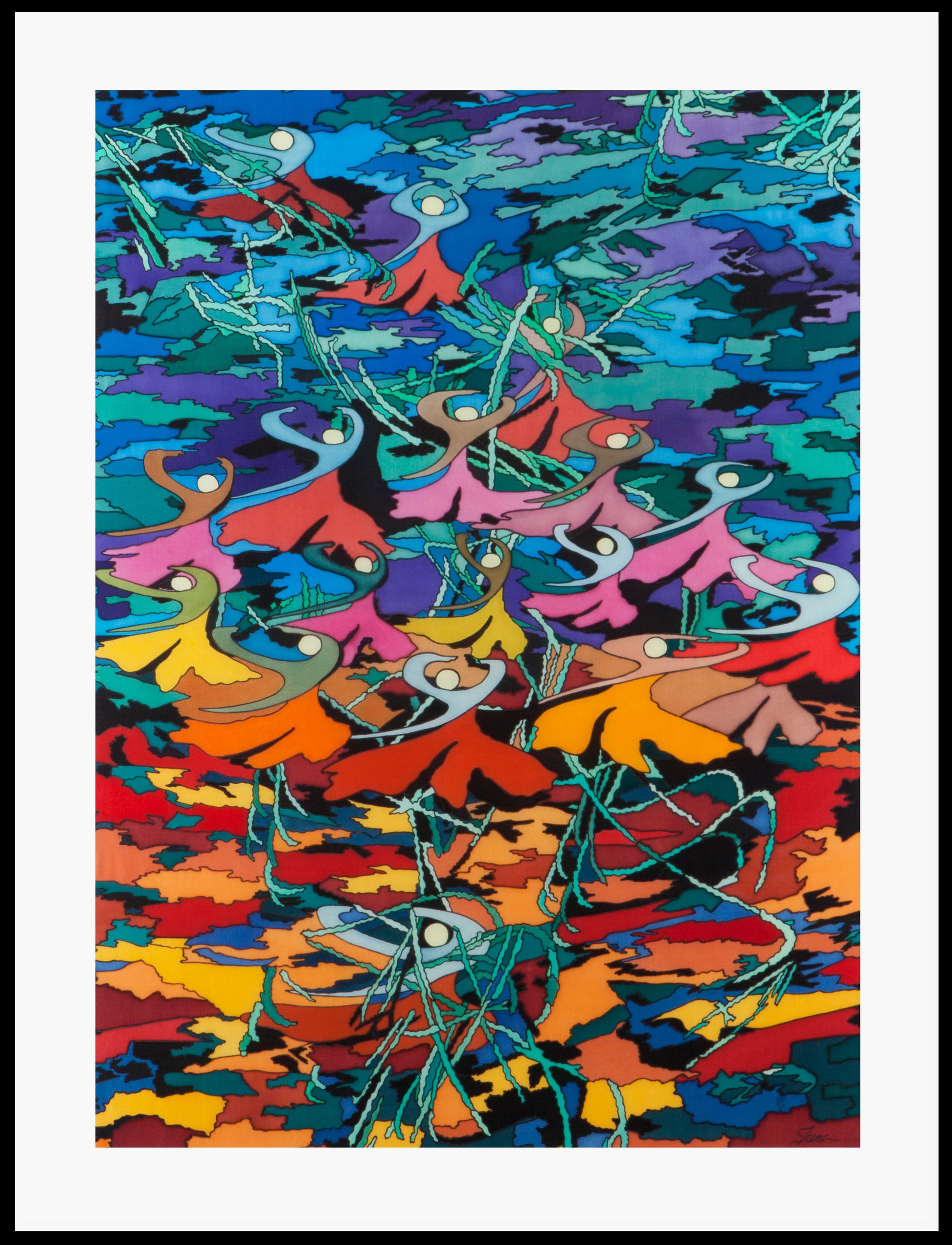 This symbolic silk painting depicts a type of mystical dance known as Sama', where dancers gather in a circle and, through a specific rhythm and movements, attain a state of ecstasy. Sama' dance is considered a form of meditation because it helps individuals establish a deeper connection with themselves and with the Creator through movements and music, allowing them to journey inward towards mysticism and love.To set the colours permanently,I used the steam setting technique.